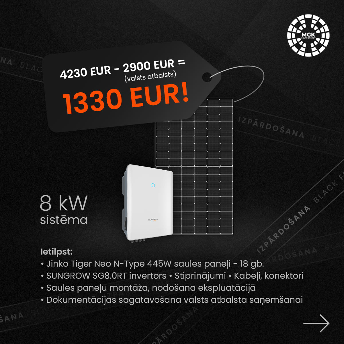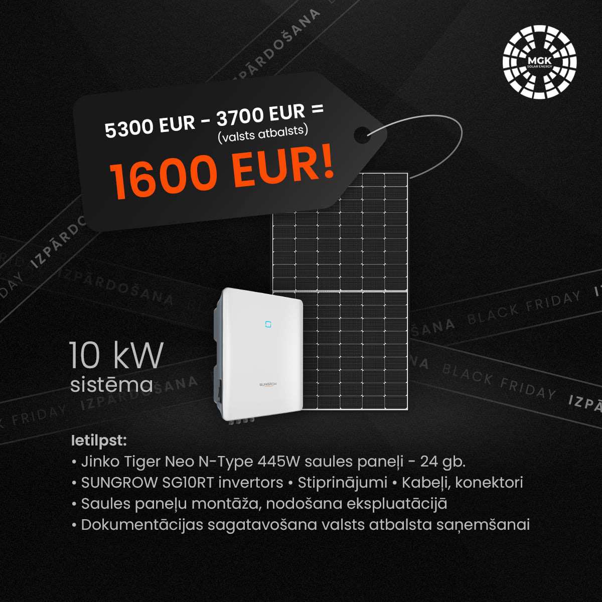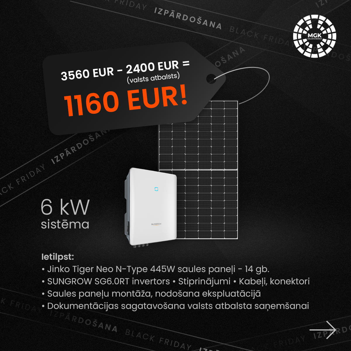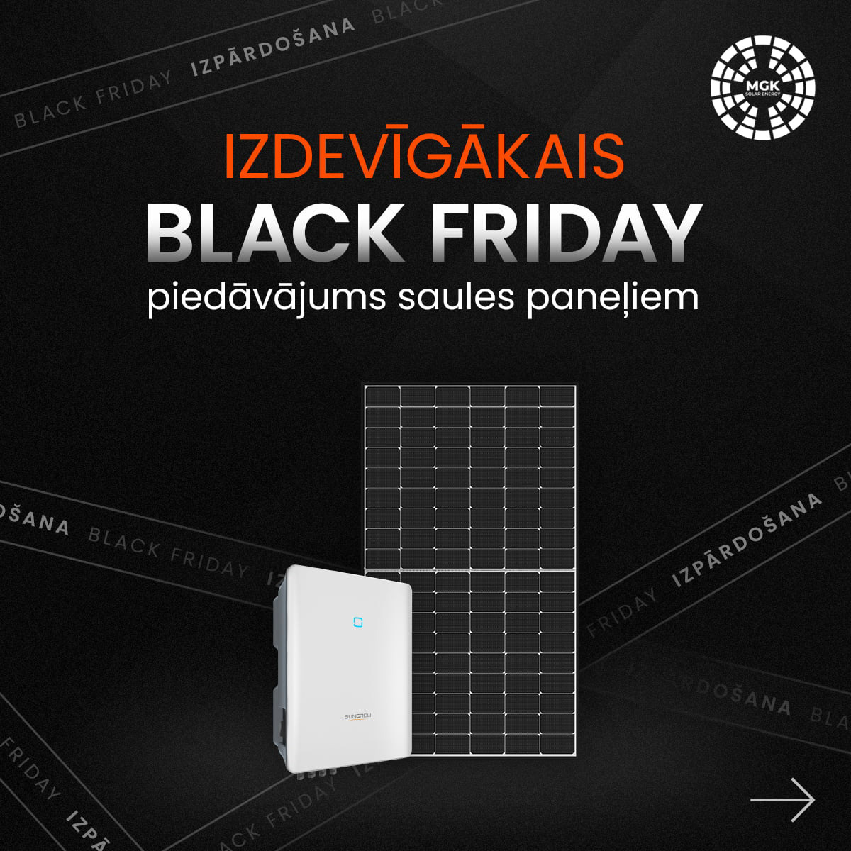 MGK Solar: Black Friday carousel campaign. Modular layout and consistent visual language across frames.