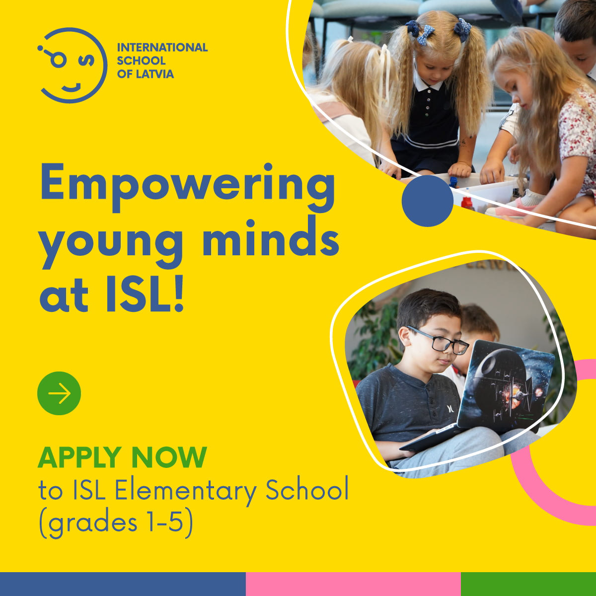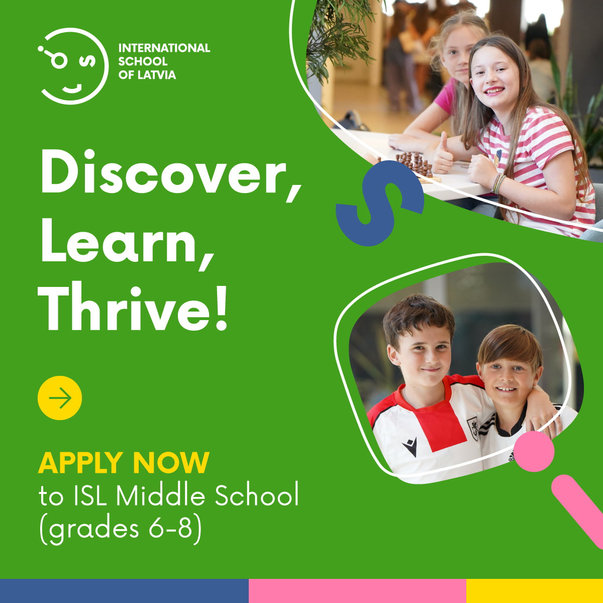 International School of Latvia: Concepting and visual system for 4 school levels. Delivered static and animated assets in multiple formats.
